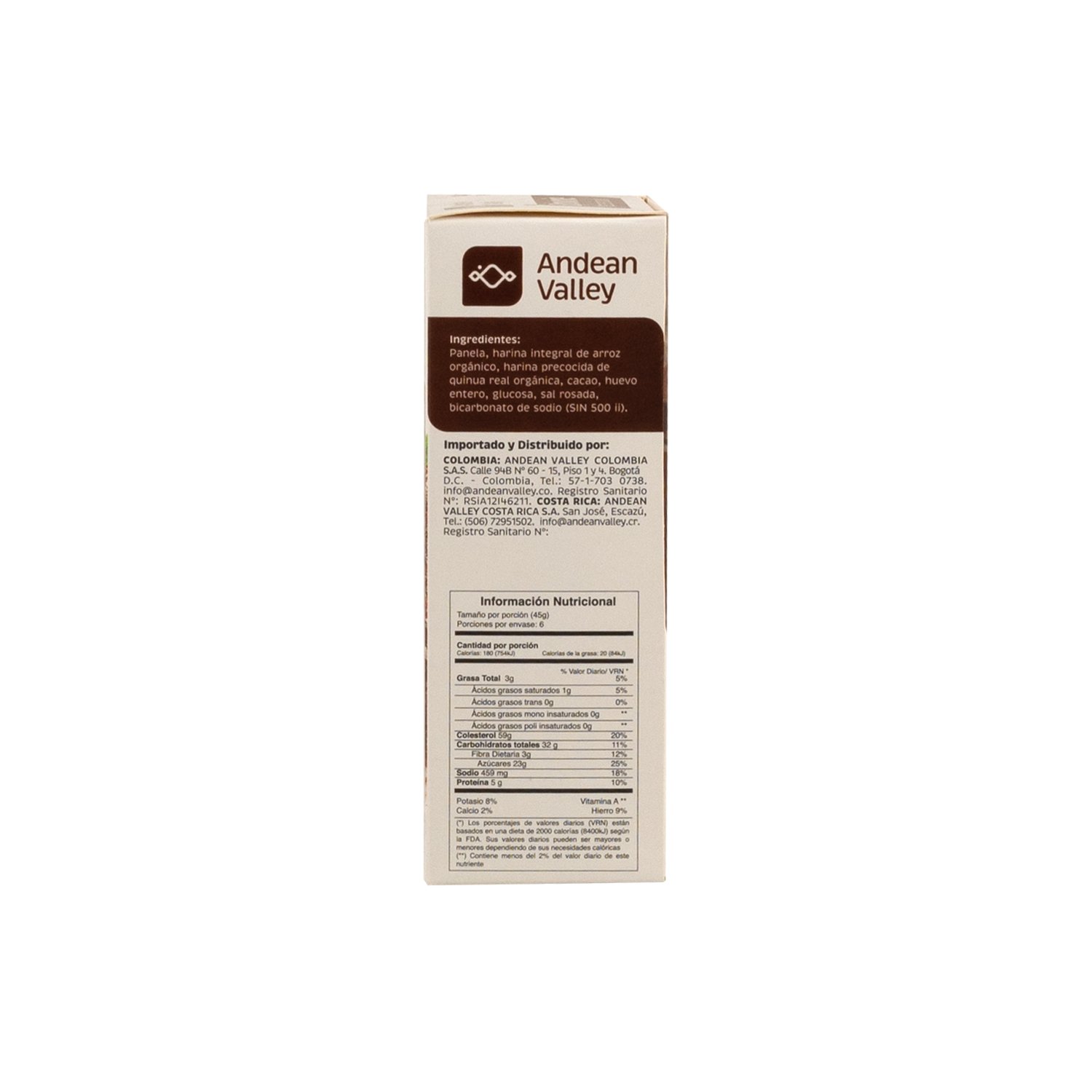 Ingredientes: Panela, Harina integral de arroz orgánico, harina pre cocida de quinoa real orgánica, cacao, huevo entero, glucosa, sal rosada, bicarbonato de sodio (SIN 500 ii).